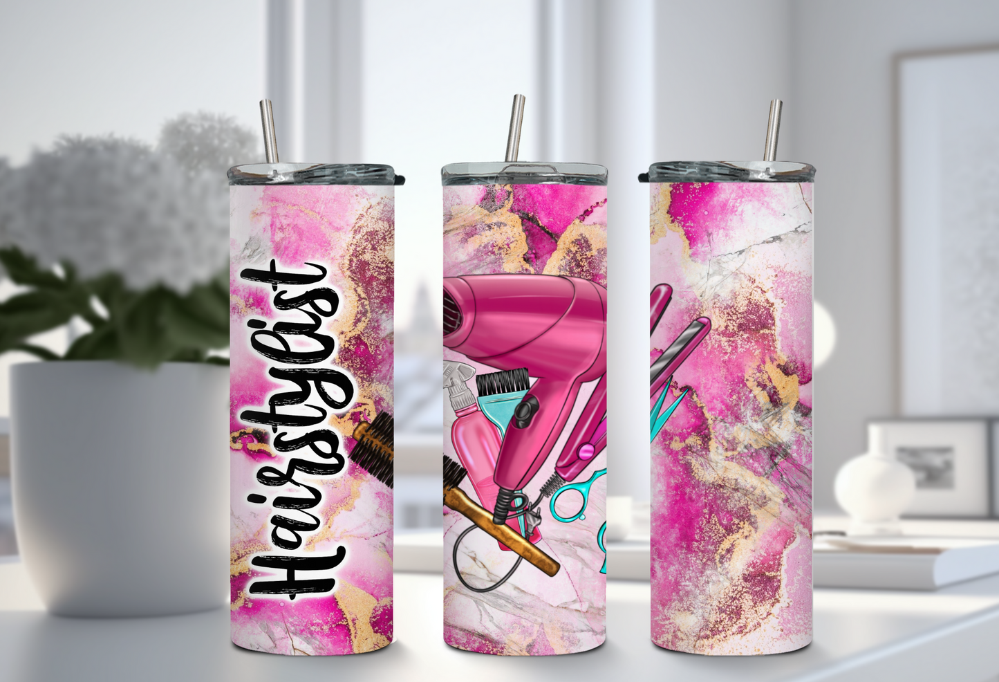 Introducing the HAIRSTYLIST TUMBLER - the perfect accessory for busy hairstylists. With its convenient design, this tumbler will keep your favorite drinks hot or cold for hours, allowing you to stay hydrated while creating stunning hairstyles for your clients. Stay refreshed and stylish on-the-go with the HAIRSTYLIST TUMBLER.